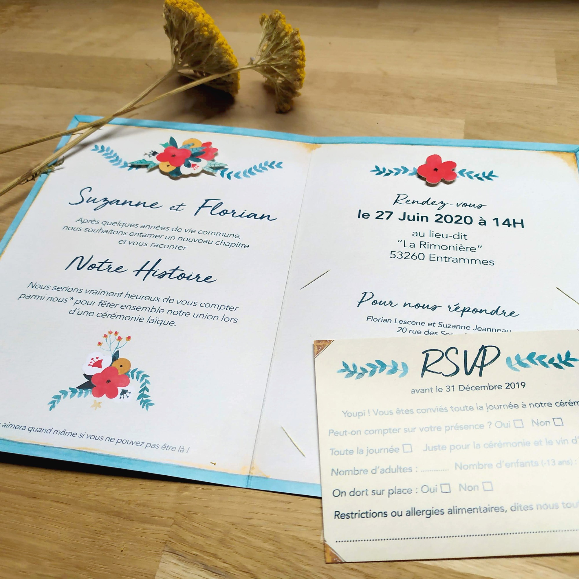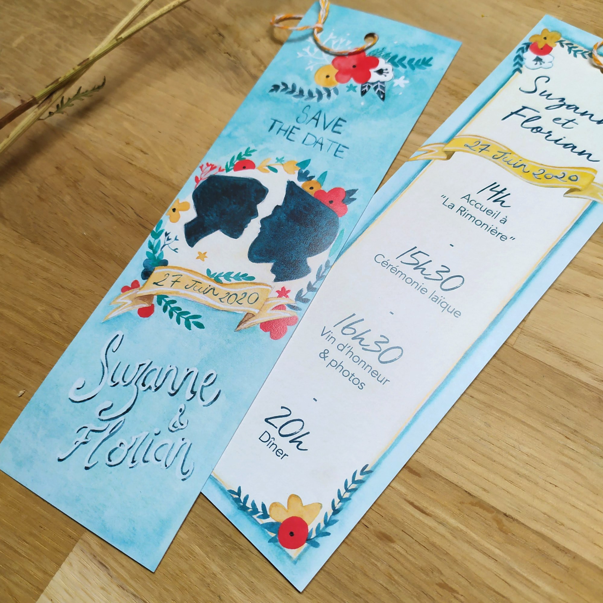 Ce faire-part à l’aquarelle, poétique et colorée est à l’image de la fête que nous souhaitions donner. Les petits élément floraux en volumes viennent habiller et apportent une petite touche d’originalité à l’ensemble.
