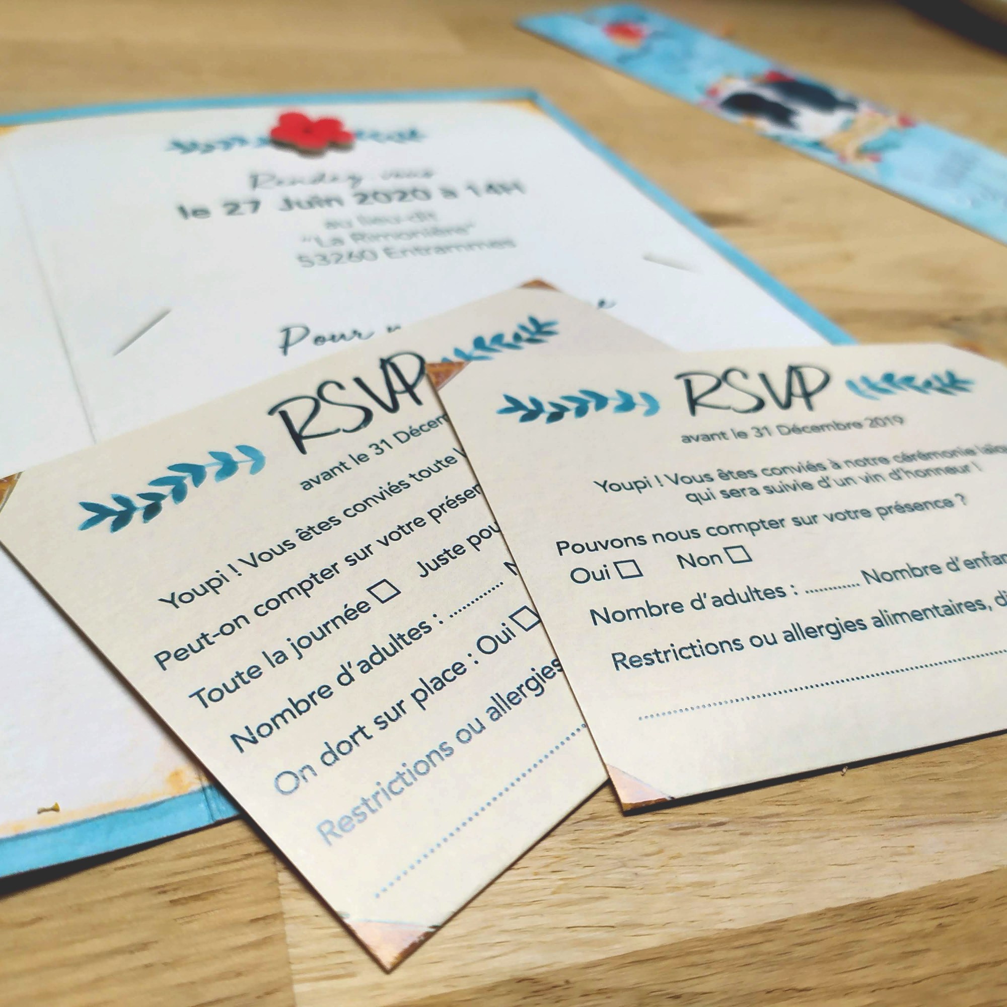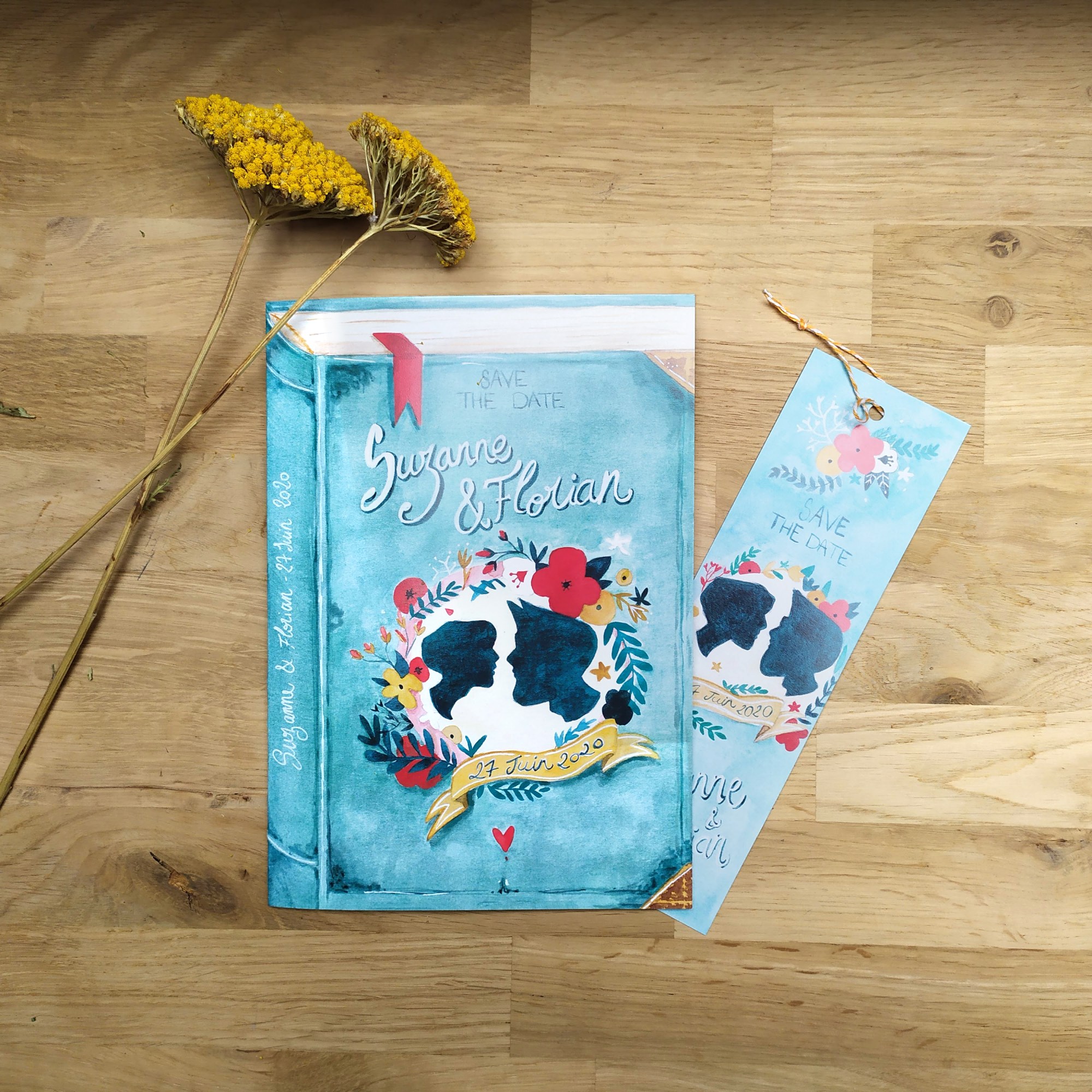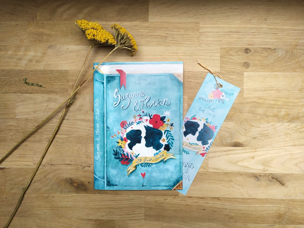 Pour notre mariage, j’ai réalisé notre faire-part sur le thème du livre. Ce faire part s’accompagne d’un marque page récapitulant le programme de la journée ainsi que deux cartonnettes interchangeables en fonction du type d’invitation.