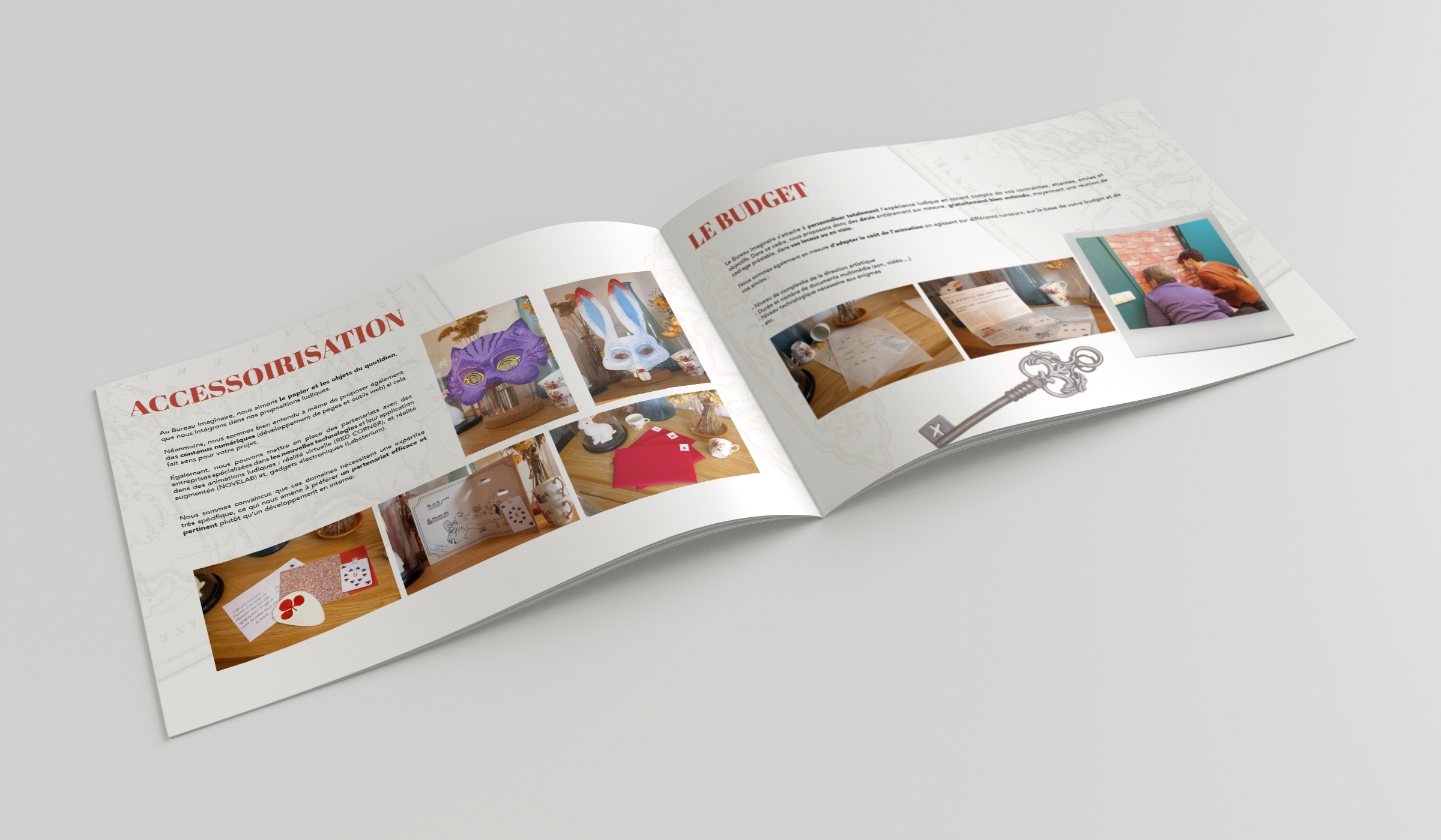 Je me suis personnellement occupé de la réalisation de notre logo et de notre charte graphique. La clé et la serrure portent ici de nombreux symboles : celle de la résolution d’une énigme (ouverture d’un cadenas ou sortir d’une escape room), un échappatoire ou une sortie de l’ordinaire (comme l’expérience proposée à nos clients) et pour finir, elle représente notre amour des accessoires et des objets manipulables pendant nos jeux. Nous souhaitions également jouer sur les codes du fantastique et du fantasque en optant pour cette typographie Bodoni « dansante » qui s’associe à un fond parcheminé rappelant les cartes aux trésors.objets manipulables pendant nos jeux.