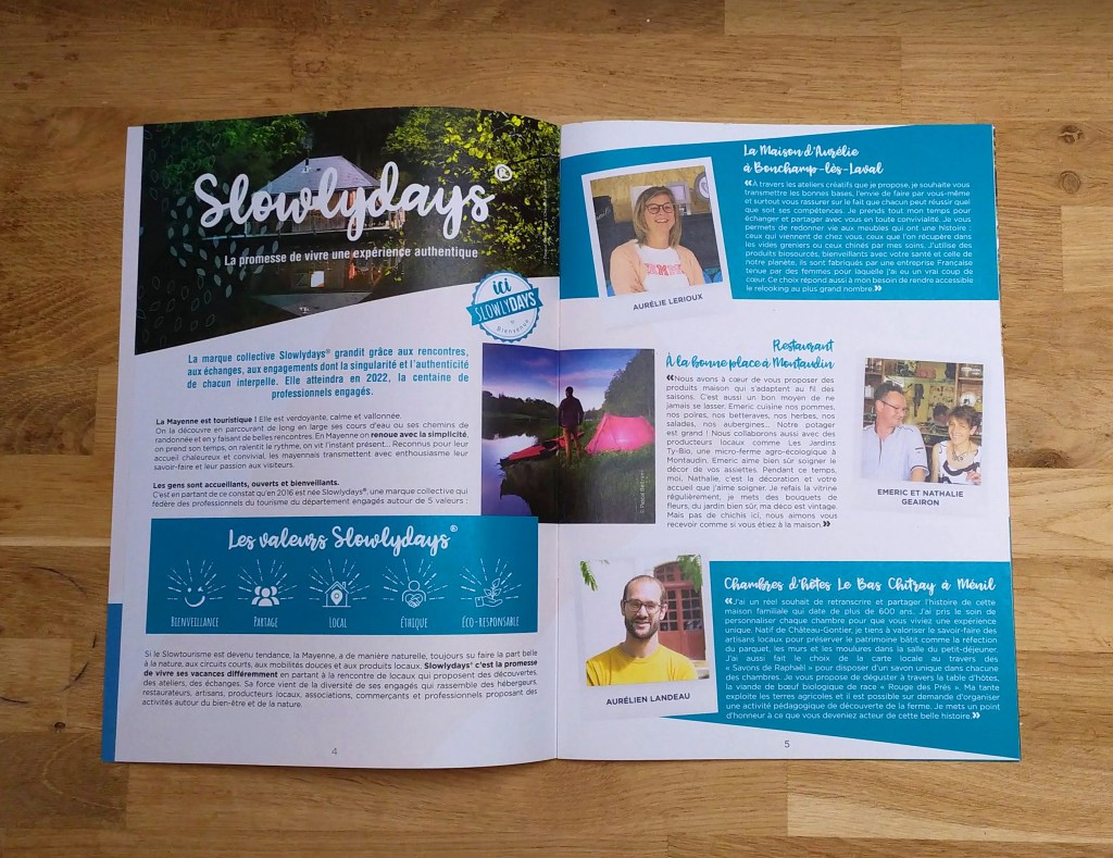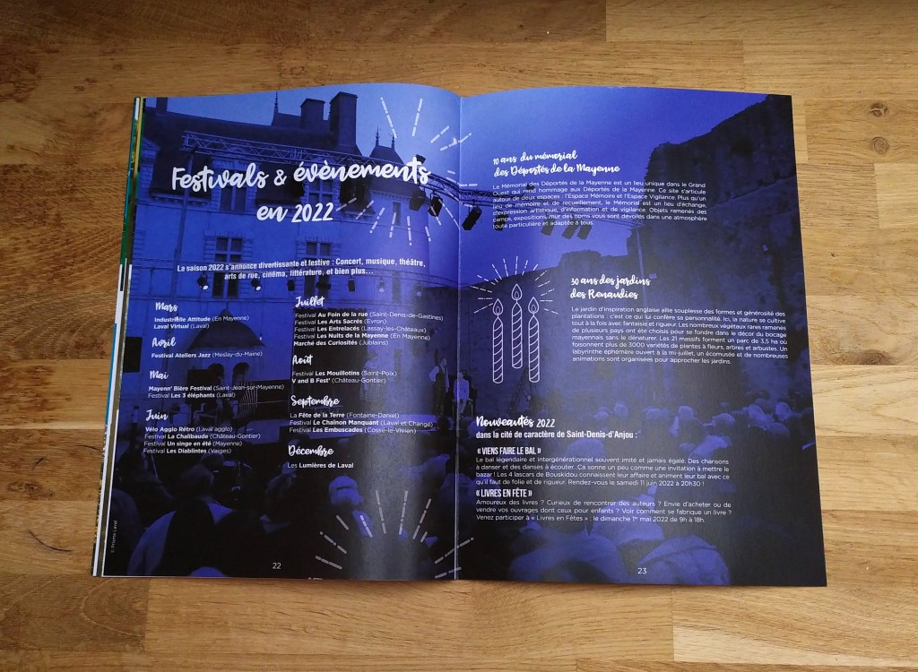 Mayenne Tourisme a fait appel à moi pour la réalisation de leur dossier de presse 2022, une brochure piquée de 24 pages présentant les beautés Mayennaise. Une mise en page dynamique inspirée de la charte graphique de Mayenne Tourisme qui met particulièrement en avant les visuels.