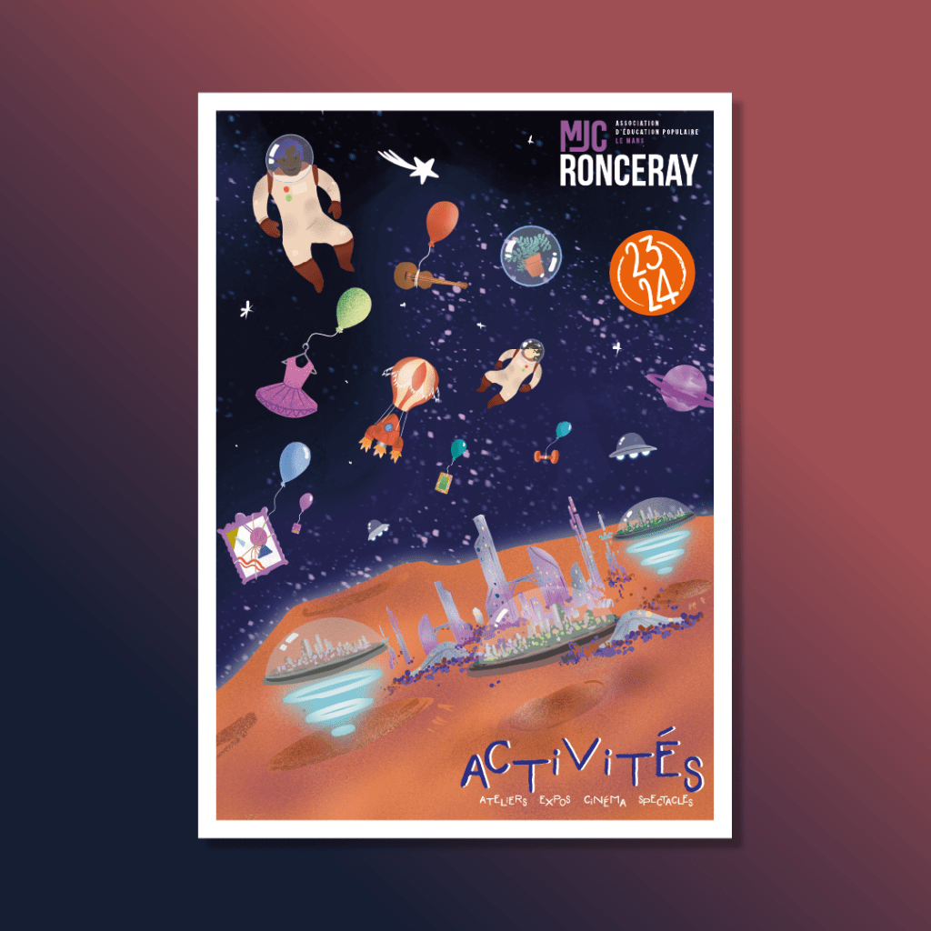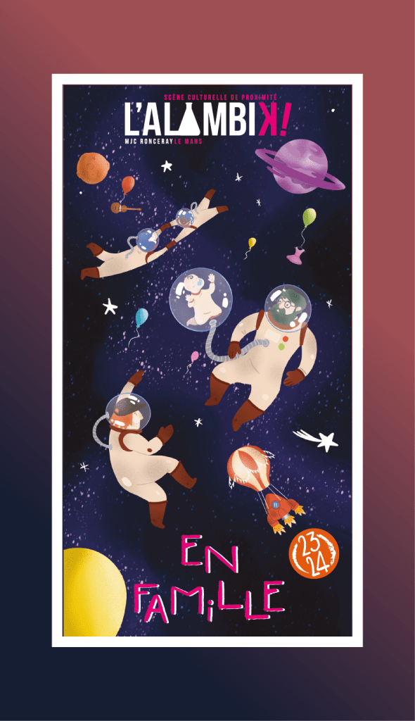 Dans la continuité des des visuels de 22/24, j’ai développé une piste graphique spatiale ! Nous retrouvons nos personnages de l’année précédente dans leurs plus belles combinaisons à la recherche de nouvelles planètes.